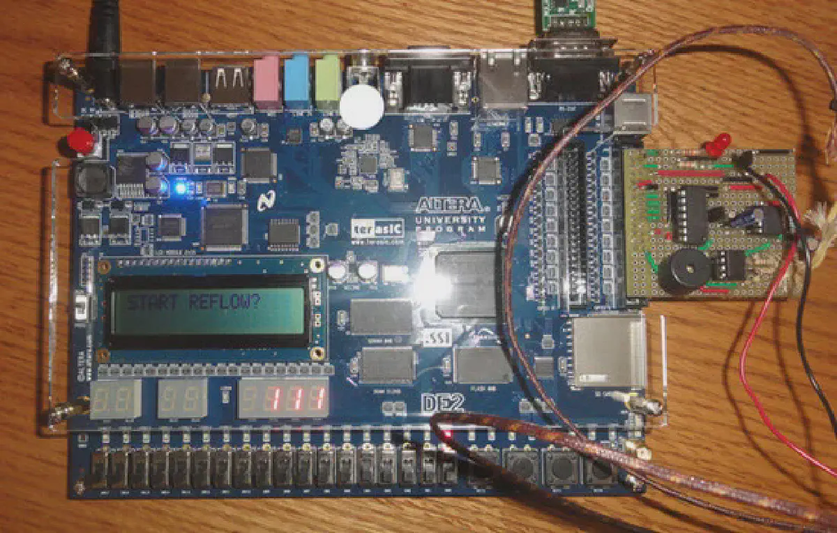 I worked in a group of six to build a reflow soldering oven controller in assembly for the DE2-8052 microcontroller and a Java application which allowed users to set their reflow parameters using the FPGA or an Android device of their choice. We addressed the project requirements by creating an effective solution in assembly and added the ability to transmit data over serial to a Java application which created a strip chart for the current oven temperature and additionally hosted the SQLite database necessary for the integration of our Android application. The Android application which allowed users to set their desired reflow parameters and additionally receive real-time temperature readings and elapsed time which provided a better overall user experience.